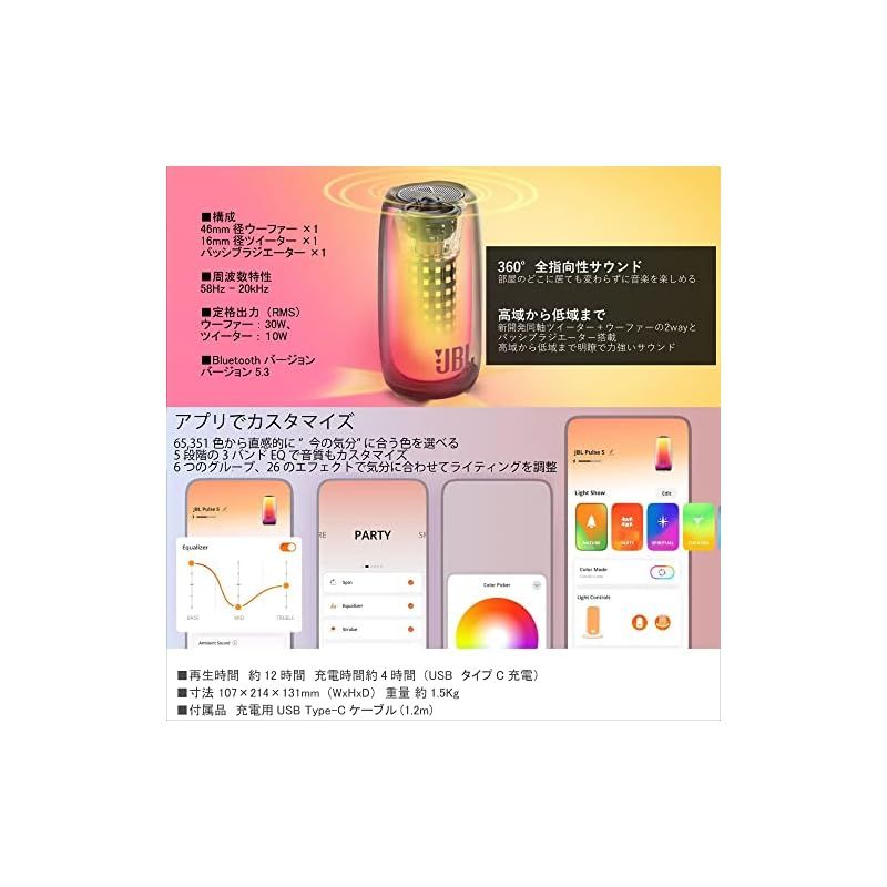 商品名:JBL PULSE 5 Bluetoothスピーカー USB C充電/IP67防塵防水/マルチカラーLED搭載/同軸2wayスピーカー ブラック JBLPULSE5BLK