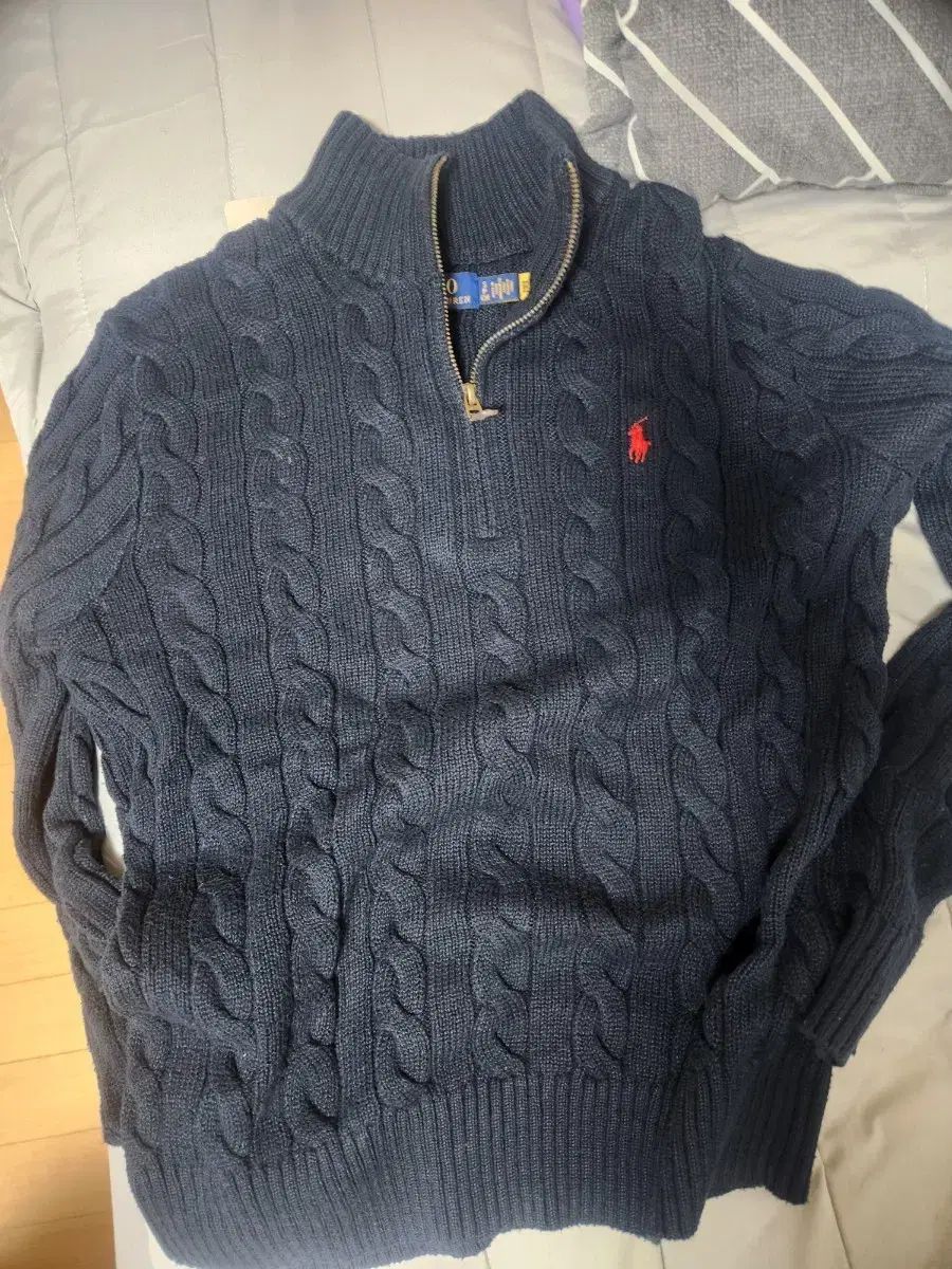 ラルフローレンのネイビーケーブルニットのハーフジップアップです。鮮やかなネイビーカラーに赤いロゴがアクセントになっています。ケーブル織りの品質はとても良いです。これはデパートでオンラインで購入した本物の製品です。