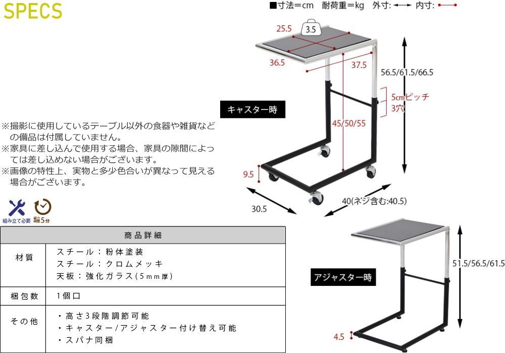 [その他]組立式(約5分)、高さ3段階調整可能、キャスターとアジャスターの付け替え可能、スパナ同梱