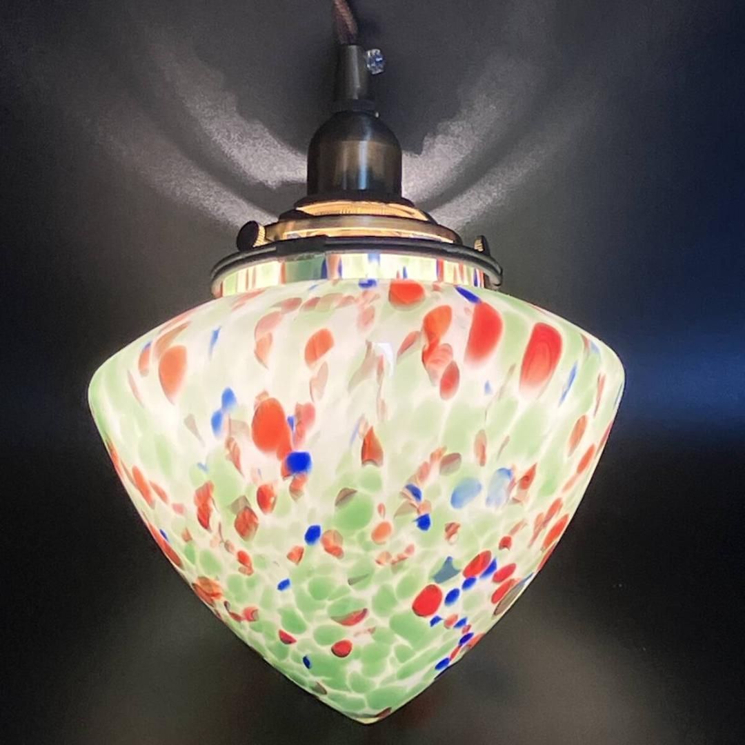 グリーンをベースに、レッドやブルー、ホワイトなどが散りばめられたスパッタ模様が印象的で、消灯時でもインテリアとして存在感を放ちます。
